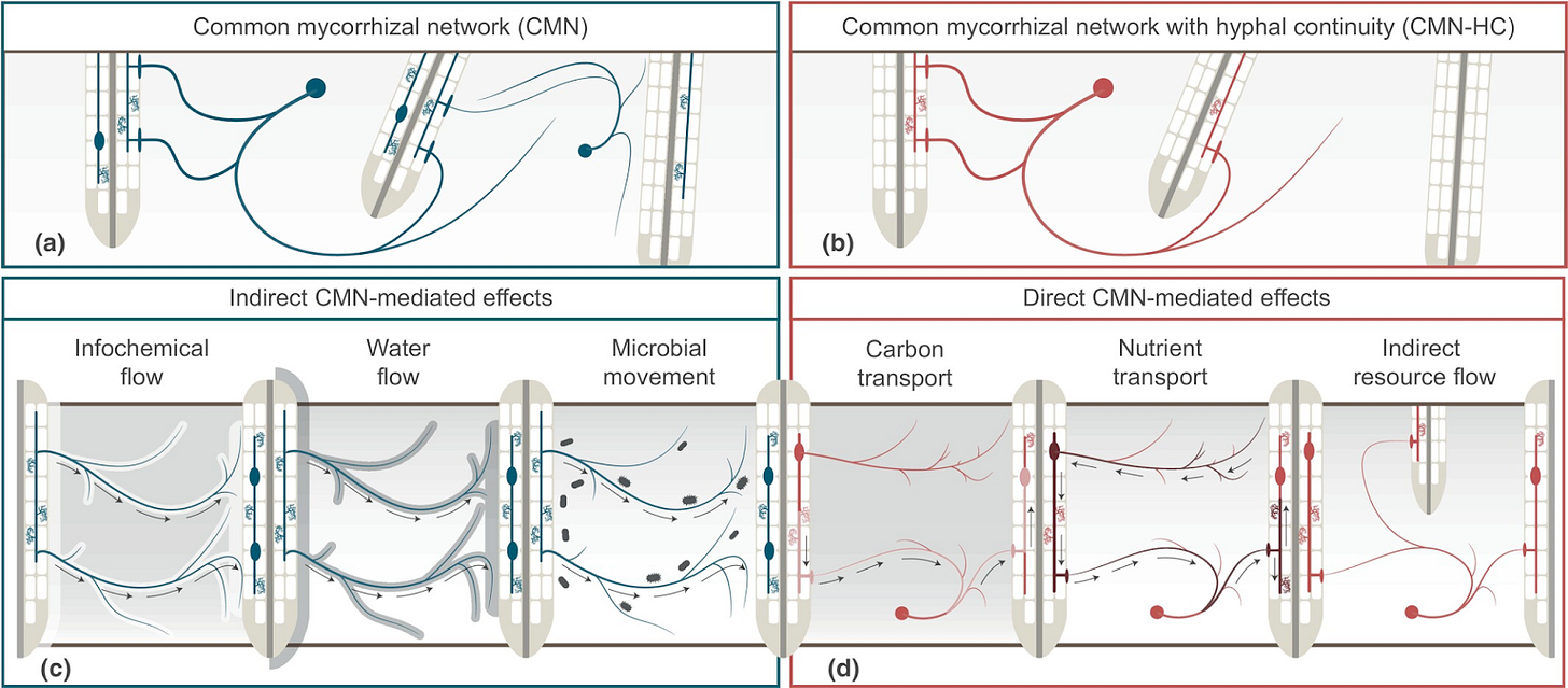The mycelial network runs three channels simultaneously. Slow channel: nutrient and carbon transfer over days to weeks, plants export photosynthate, fungi return phosphorus and nitrogen. Fast channel: chemical warning signals over hours; when one plant is attacked by insects, connected neighbors upregulate defense genes within 6 hours before anything touches them. Fastest channel: electrical signals propagating along hyphal membranes in seconds, though the research on this one is contested enough that I won’t oversell it. Persistent state, alerts, and real-time coordination. The same network, differentiated by urgency.