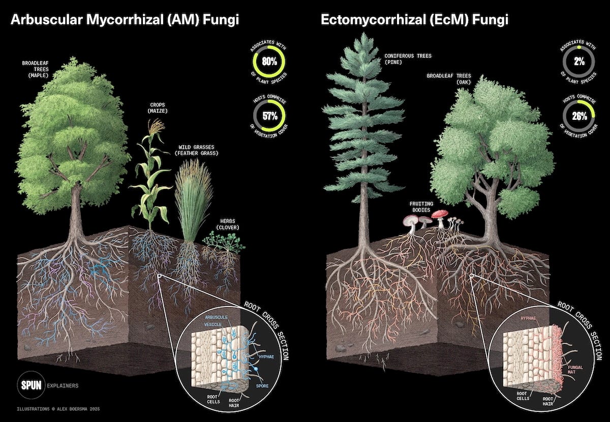 Mushrooms have mycelium, dense underground networks of fungal threads connecting trees across entire ecosystems. When researchers started mapping them, they found that the architecture is scale-free: a few massively connected hub nodes and many peripheral ones. In one mapped old-growth Douglas-fir plot, the most connected tree was linked to 47 others via 11 distinct fungal species. The biggest trees can often attribute their size to being hubs of a resource and information network the whole forest depends on. Lesson there.
